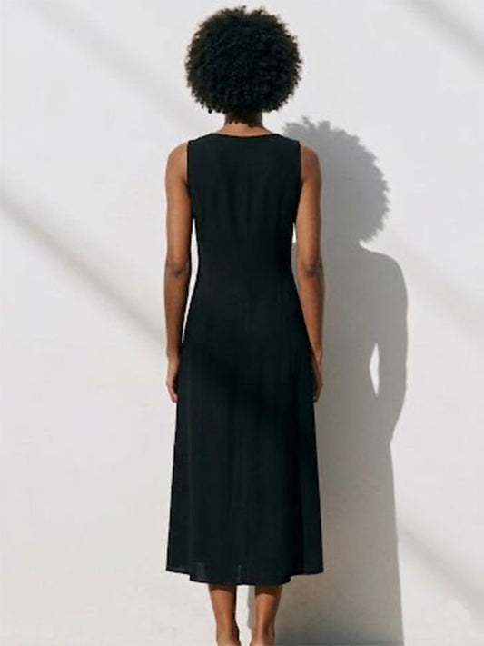 Black V-Neck Viscose Linen Dress