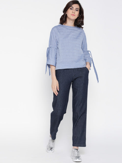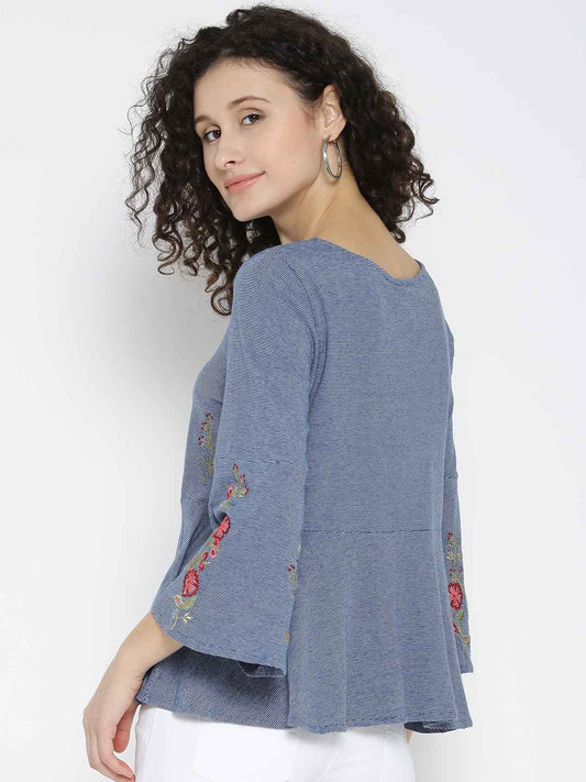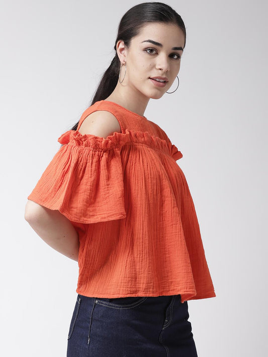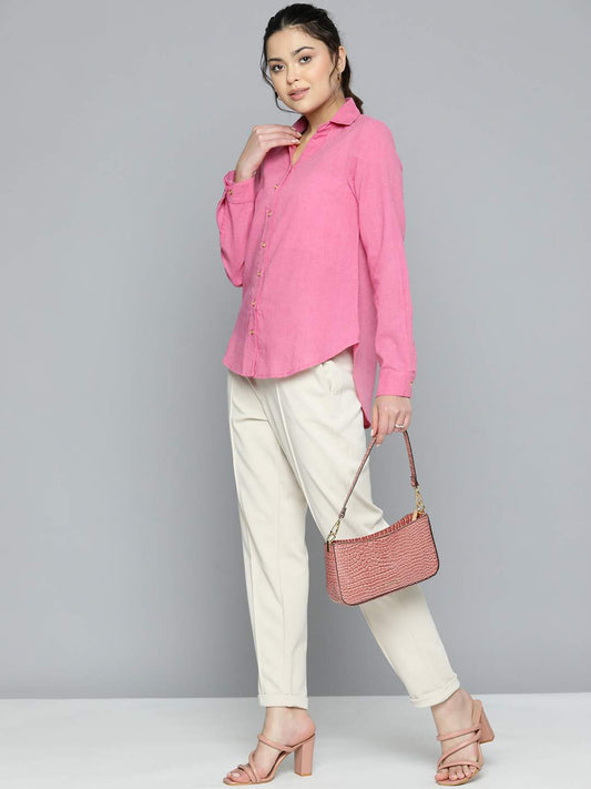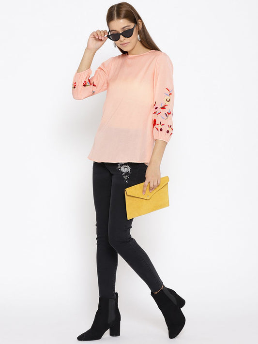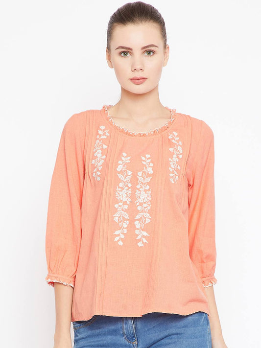 Cotton Linen Peach Embroidered & Pleat Detail Top