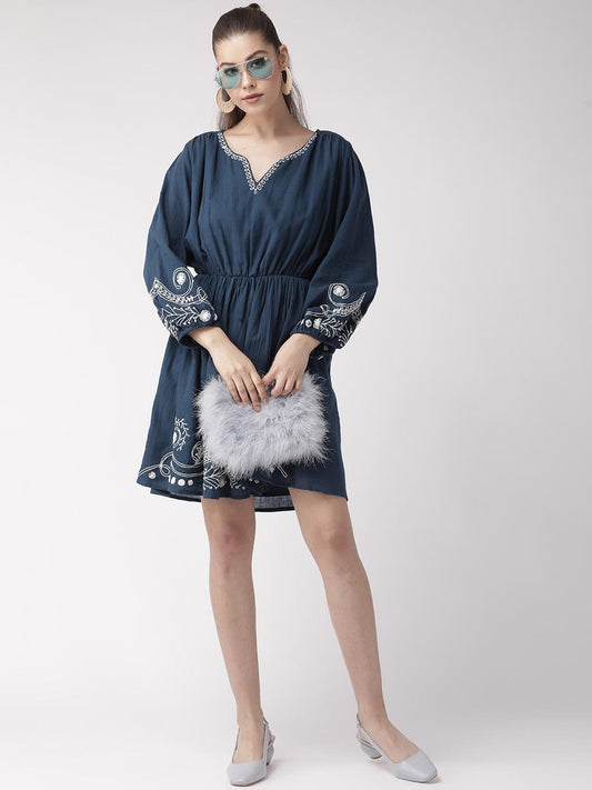 Navy Blue Embroidered Tunic Top with Frill Detail on Sleeves