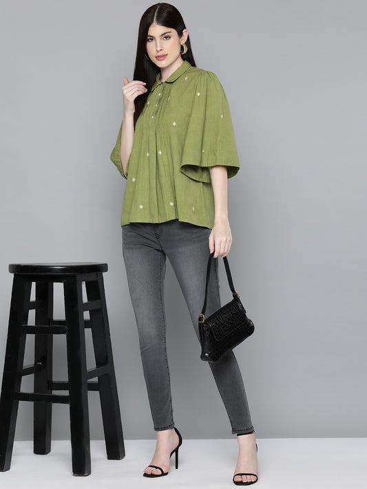 Sage Green Embroidered Shirt With Flayred Sleeves