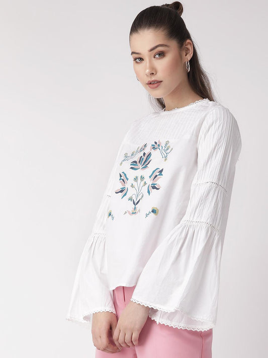 White V-Neckline Embroidered Top With Bell Sleeves
