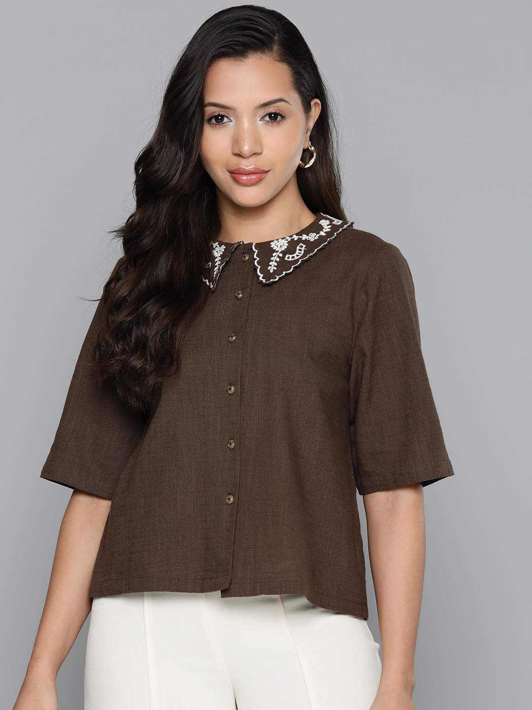 Brown front button shirt style top Floral embroidered Shirt collar, short, regular sleeves Woven cotton Button closure