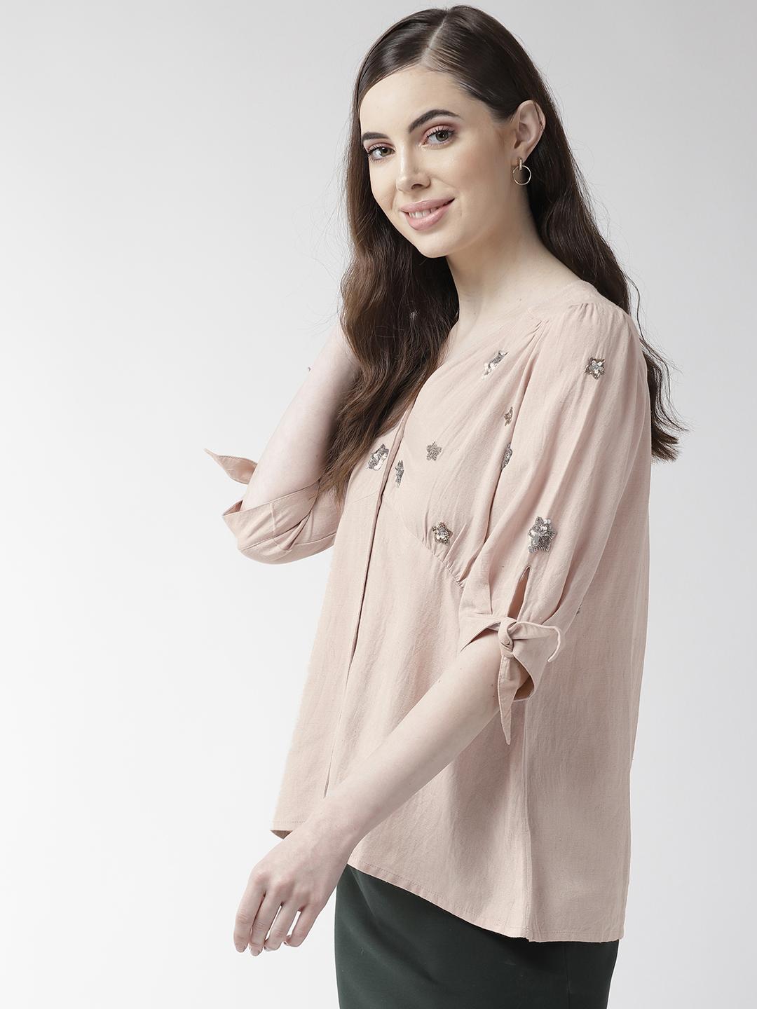 Dusky pink coloured embellished woven A-line top with tie-ups on sleeves, has a V-neck, short sleeves, and button closures