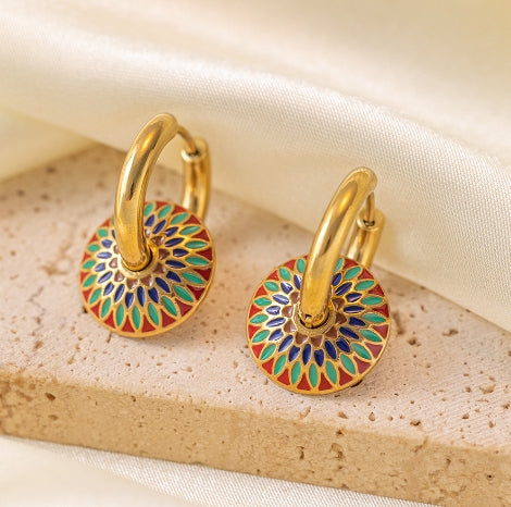 These earrings feature small, polished gold hoops with secure closures. Suspended from each hoop is a circular pendant with a vibrant mosaic pattern. The disc displays intricate petal-shaped segments in alternating colors of red, green, and blue, giving the earrings a dynamic and lively appearance. The bold use of colors contrasts with the gold-tone base, offering a striking yet balanced design.
