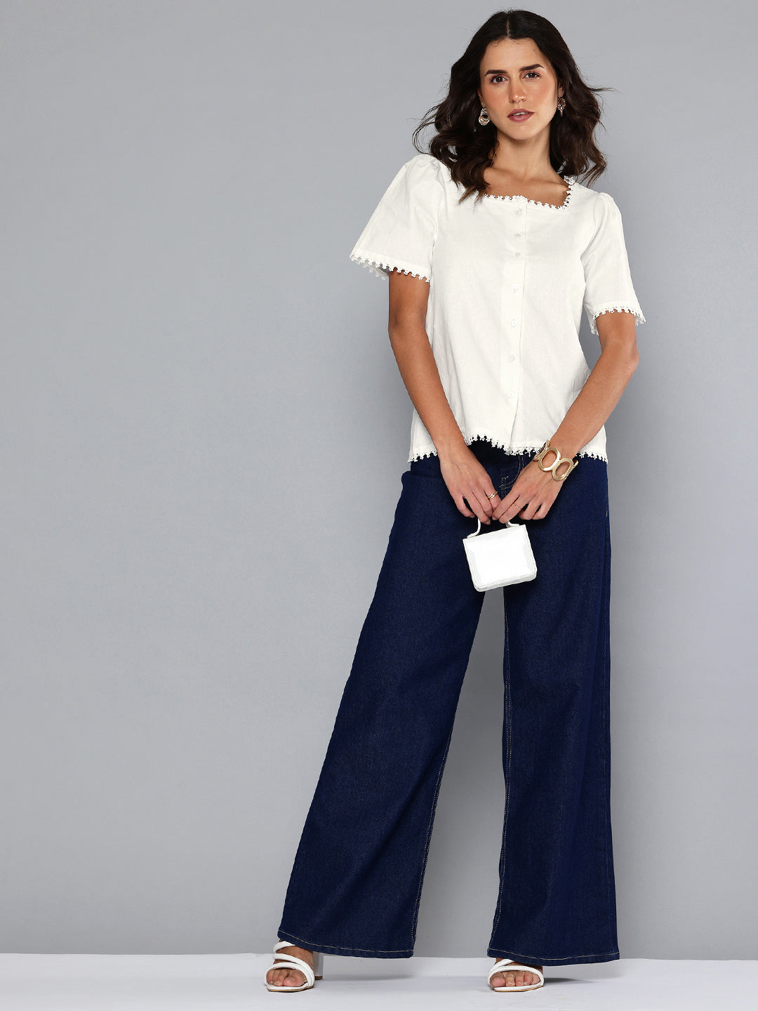 Off-white lace detail top from Scoup featuring a round neckline, short sleeves, and lace inserts on the front and sleeves. Made from linen fabric. Suitable for casual and day wear.