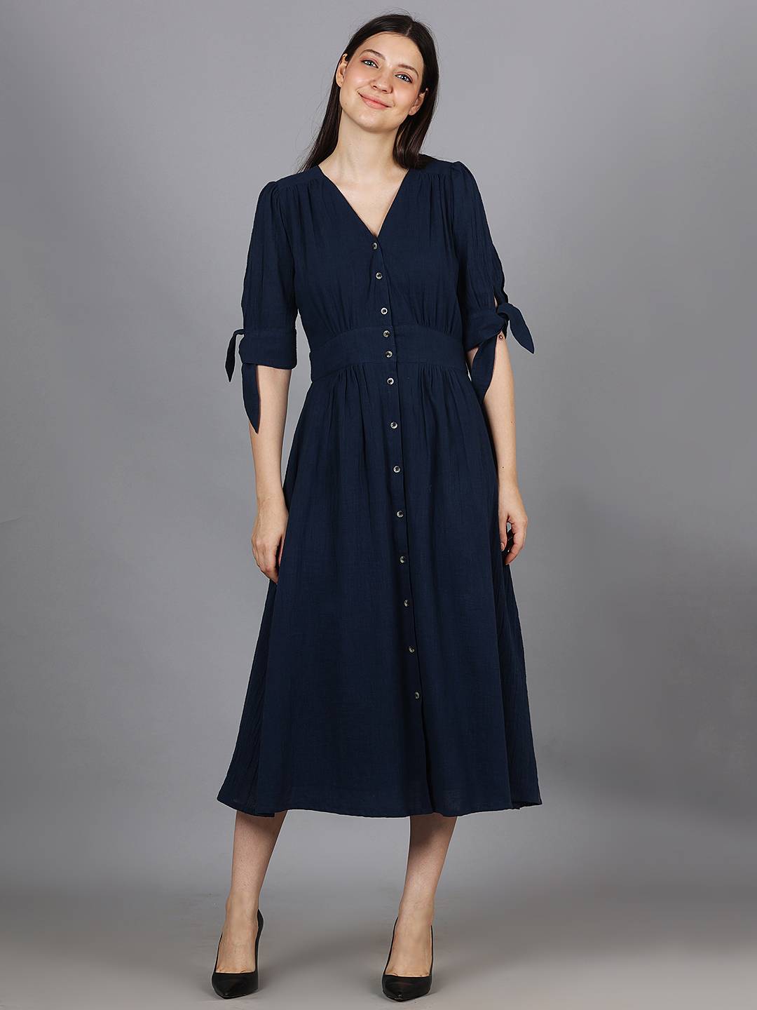 Navy Blue cotton slub gauzy Summer midi dress. Comes with V-neckline, fitted waist , front button closures and cute ties at the sleeves cuffs. It comes with attached lining. Model is wearing size S- garment chest measurement is 36" and waist is 32". Waist band starts from 14.5" from HPS(Highest shoulder point) so for someone with height less than 5 feet 2 inches waist band can go down than there natural body waist and look will not same as seen in picture.