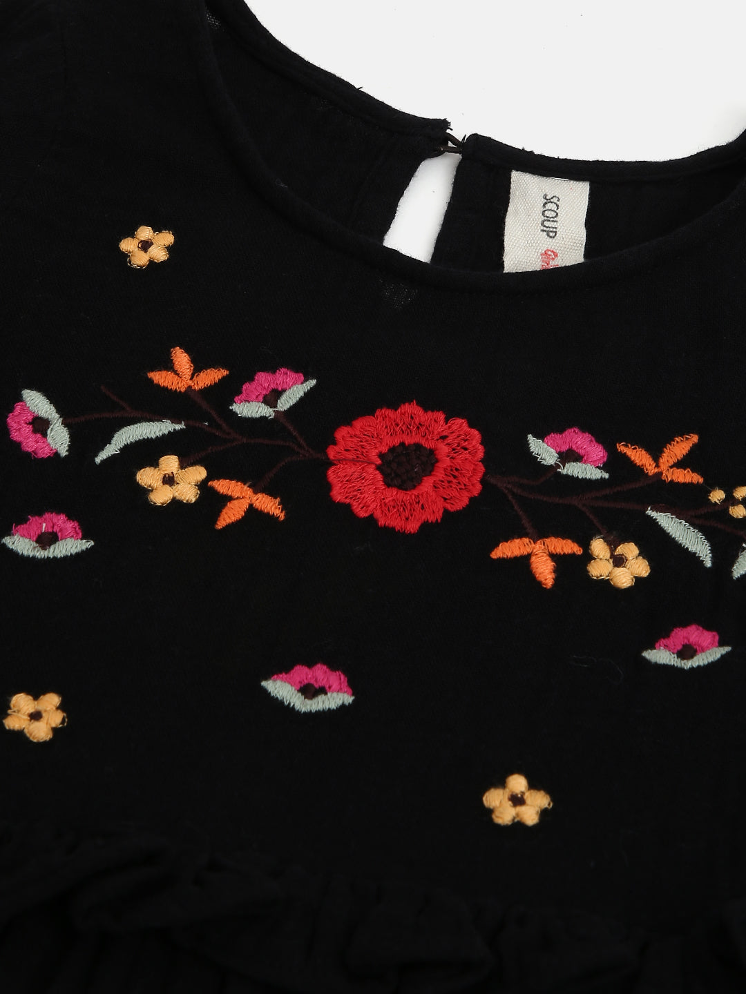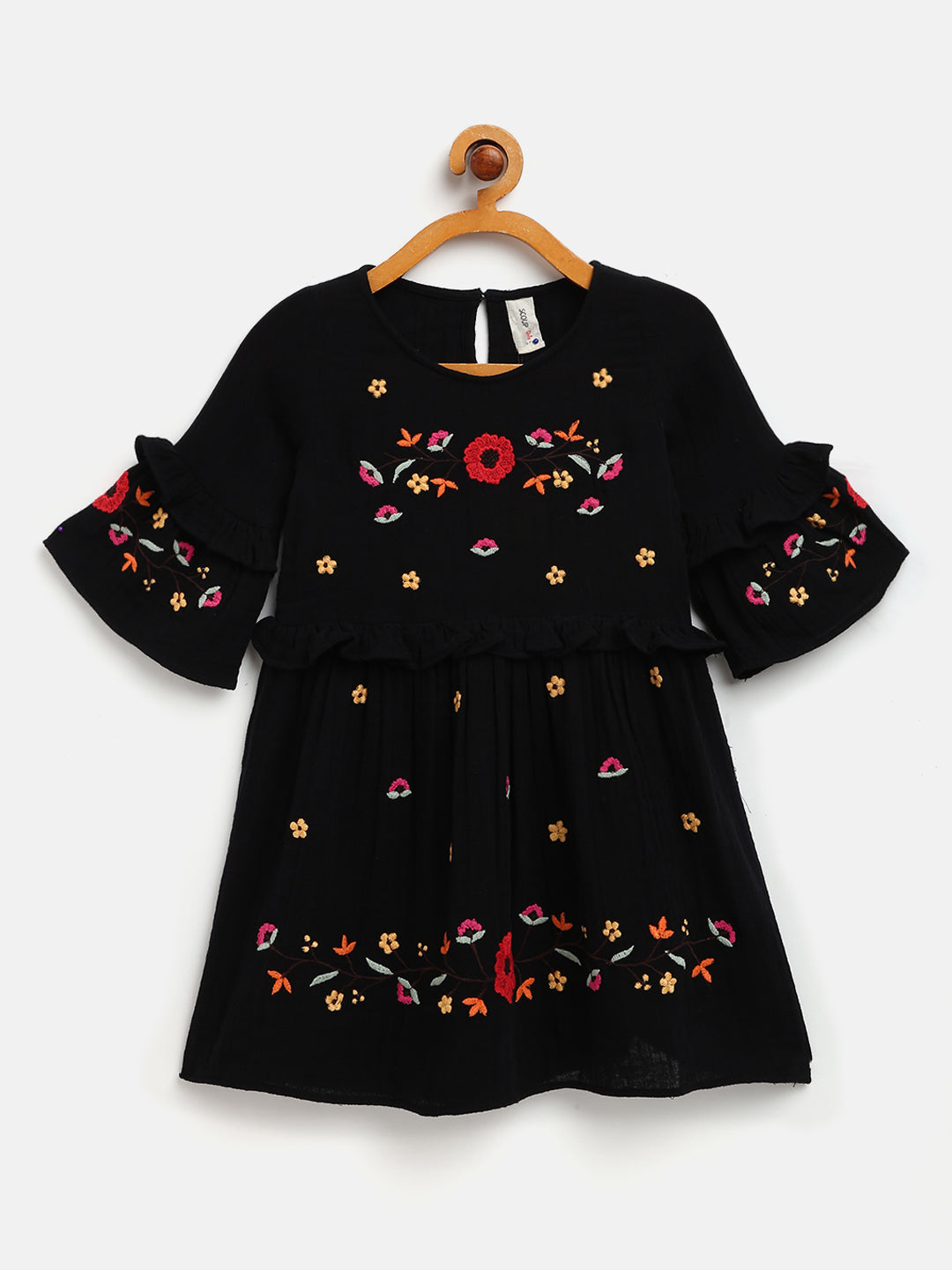 Black Embroidered Cotton Dress with Flarred Sleeves for kids girls